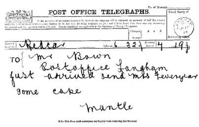 The first telegram received by Langham Post Office, was sent at 6:32pm on the 17th April 1889 from Redcar by a member of the Mantle family to the Post Master Mr Bown. The telegram was received at 7:19pm